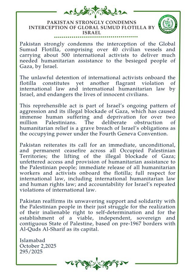 Foreign Minister Ishaq Dar added that Israel’s actions endanger innocent lives and obstruct urgently needed relief, urging for an immediate and unconditional release of all detained activists. He also called for an end to the blockade restricting humanitarian aid to Gaza.