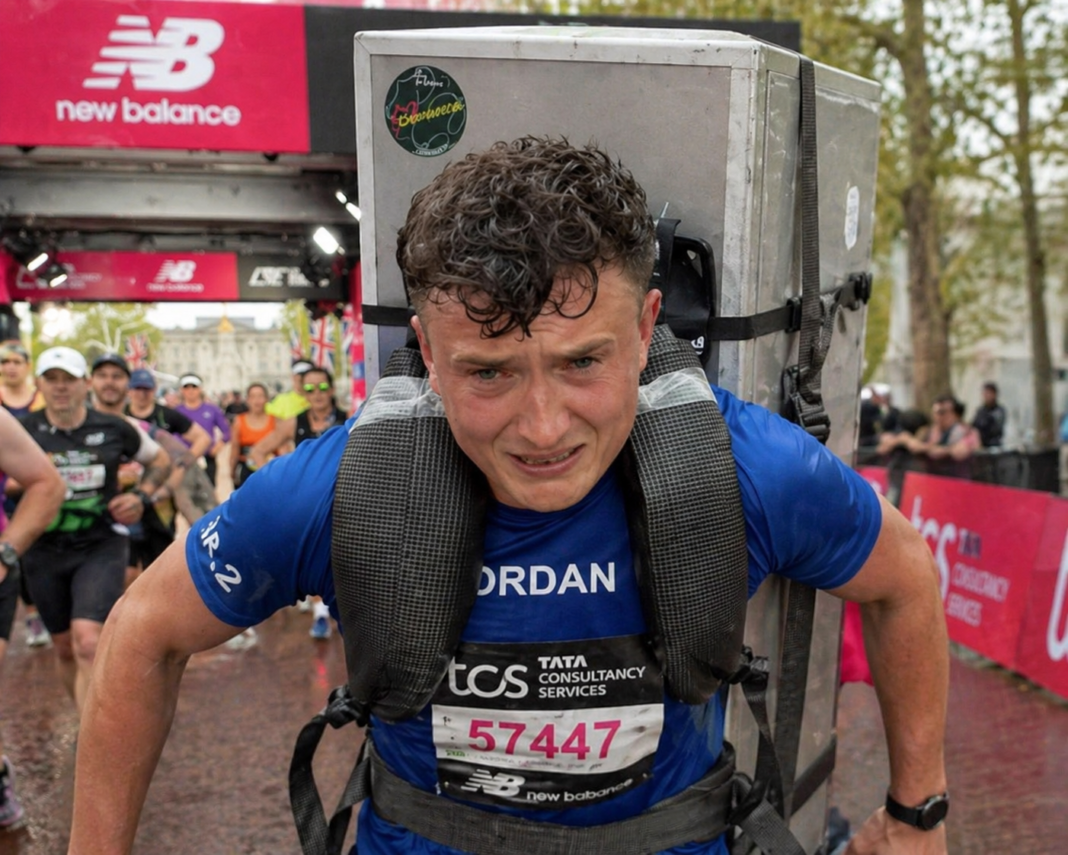 In a moment that left many stunned and inspired, 30-year-old Jordan Adams was seen running the London Marathon—with a full-sized fridge strapped to his back.